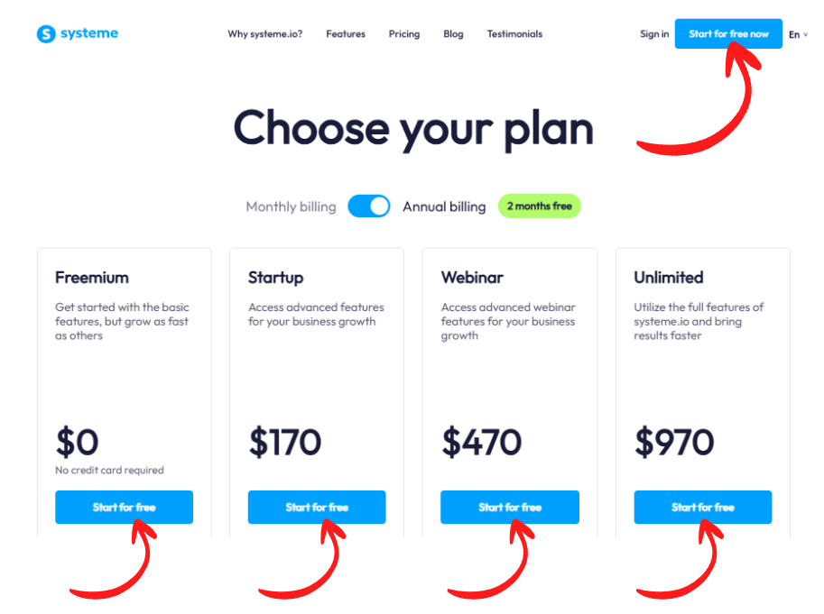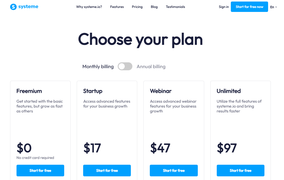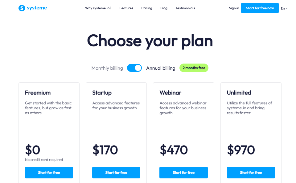 Systeme.io offers one of the best free funnel builder plans on the market, along with three paid plans: Startup, Webinar, and Unlimited.