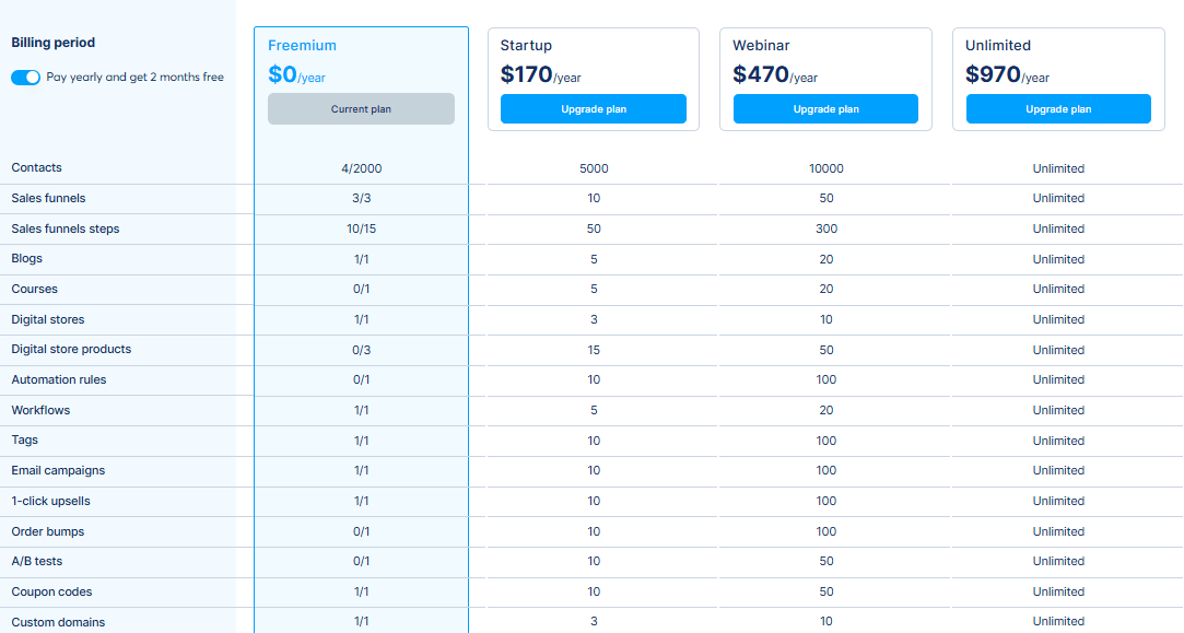 If you want to create professional funnels with multiple upsells, downsells, bump offers, and automated follow-ups, the Free plan simply won’t be enough.