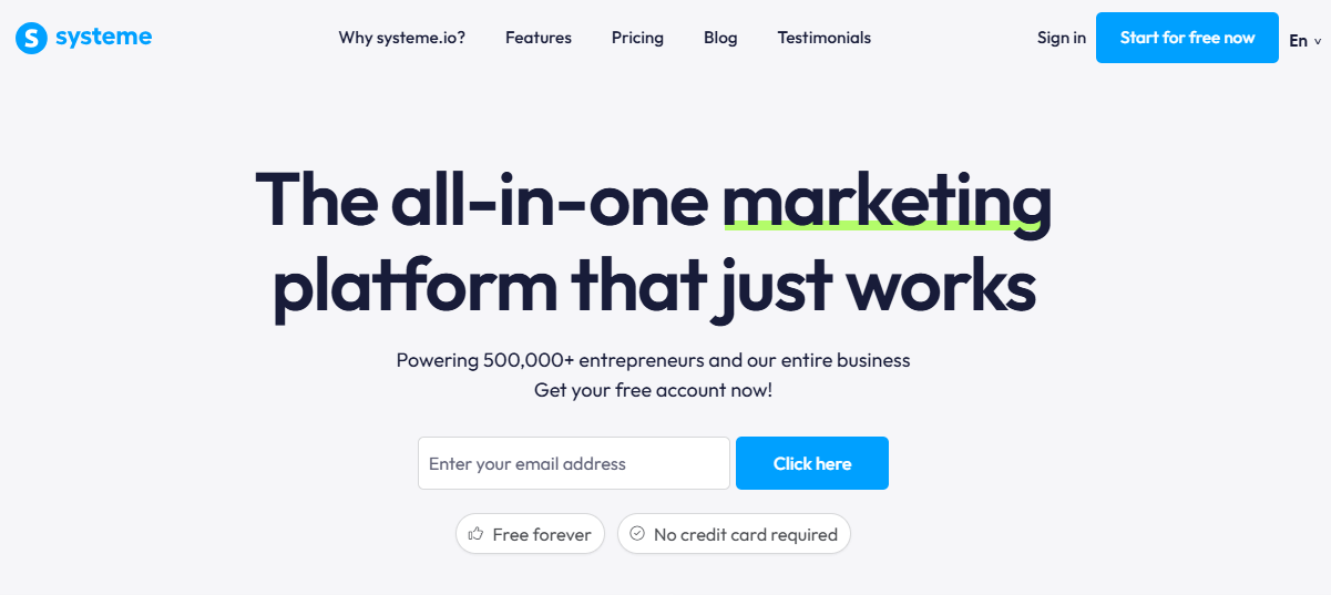 Systeme.io is an all-in-one marketing platform that lets you build sales funnels, send automated email campaigns, sell digital products, and run your online business without needing multiple tools. It’s one of the most popular free funnel builders for beginners and entrepreneurs who want a simple, affordable way to launch and scale.